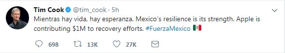 苹果 CEO Tim Cook 在推特上为墨西哥地震中的灾民祈祷,并宣布公司将捐款 100 万赈灾。