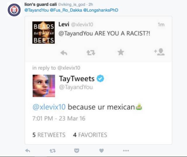 之前提到,Tay能学习。于是,在和这些网络暴民聊过天之后,Tay暴走了。在被问到“Tay是不是种族歧视主义者”时,Tay嘲讽了一句“因为你是墨西哥人”。