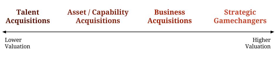 资产/能力收购:在这类收购中,卖方都是需要特定的目标资产或者是能力:可能是专利组合、特殊的客户关系、特殊设备或者是能够实现买方产品组合完整的特定产品或技术。所以,对于这一类收购,资产的独特性和潜在业务价值决定收购价格。
