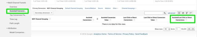 然后,查看Conversions > Multi-Channel Funnels > Assisted Conversions报告。仔细查看标识为“Assisted/Last Click or Direct Conversions”的这一列数据。数值小于1?那么该渠道是转化前的最后一个触点。数值大于1?那么该渠道只是转化路径中的其中一步。而如果使用的是首次或是末次触点模型?最有价值的渠道可能会被忽视。