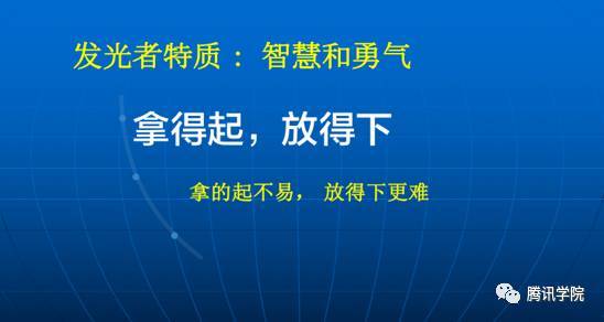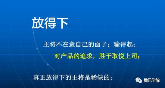 在大型组织里,要做到“放得下”是比“拿得起”更为困难。在腾讯学院的时候,有些机会曾和一些产品老将有过交流,有的人已有一定的财务自由度,但还是“放不下”,或是放不下团队的荣辱得失,或是放不下个人失败的面子。在互联网行业,如果产品主将“放不下”,即使他很努力、很投入的去完成业绩指标,他也很难“发出光”,很难帮助企业改变认知,会耽误最宝贵的时间窗。