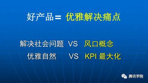 这跟风口的概念不太一样,是优雅地解决问题,而不是靠过度的营销。它是一个比较克制的东西,君子爱财,取之有道,而不是KPI最大化。好产品的价值,并不是以收入的大小、企业市值的大小来衡量的,而是它是否能较好的解决社会的痛点。