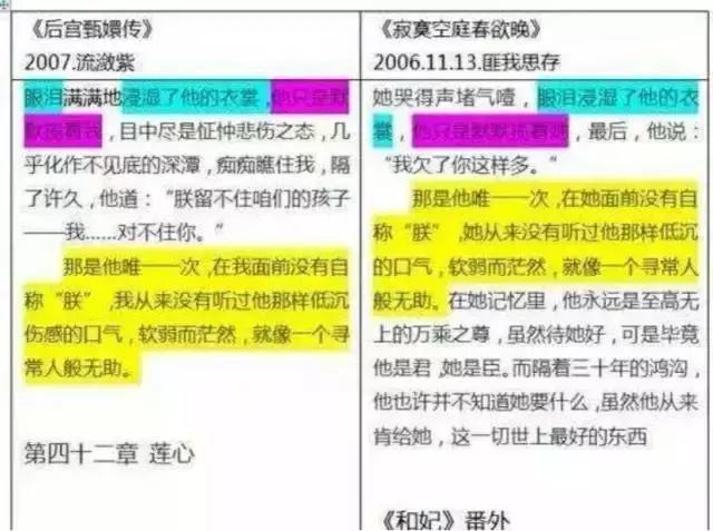 上图则是网友制作的调色盘,指出两篇小说的相似之处。在文学抄袭中常常存在这种调换句式和形容词的洗稿式抄袭,很多时候还涉及到情节的抄袭。阅读之后,往往会觉得有哪里不对,却又很难指出来。同时,为这种抄袭方式举证非常麻烦,普通的论文查阅式的程序很难检查出来,需要人为进行一遍遍的阅读和比对。