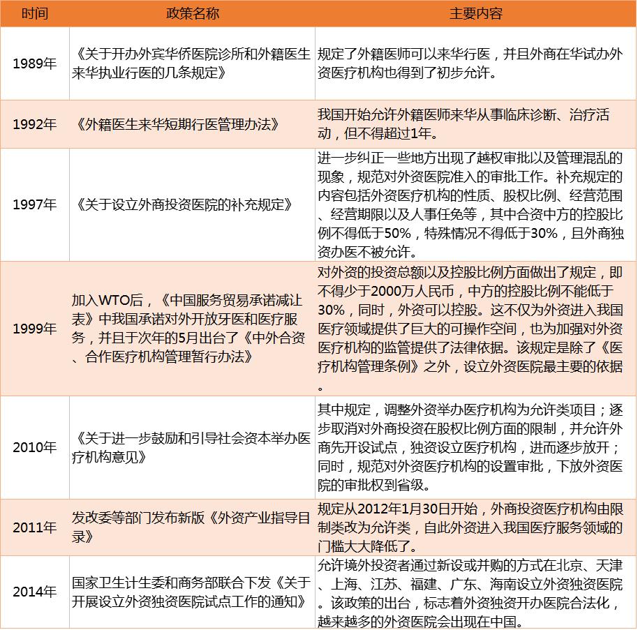 中国最早的有关医疗行业市场准入的法律文件,出现在1989年,规定了外籍医师可以来华行医,并且外商在华试办外资医疗机构也得到了初步允许。