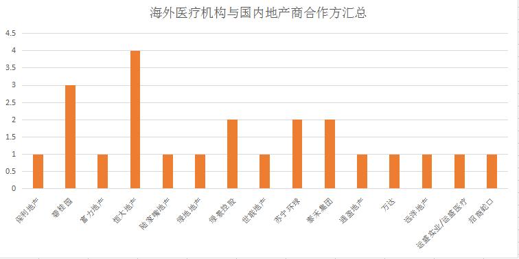 从签约合作的地产商看,包括万达、碧桂园、富力地产、恒大地产、泰禾集团、泰禾集团、苏宁环球、招商蛇口、陆家嘴地产、通盈地产、绿景控股、绿地地产、世联地产、运盛实业/运盛医疗、保利地产、远洋地产。其中与恒大地产合作的海外医疗机构最多达4个,其次是与碧桂园合作的海外医疗机构达3个。