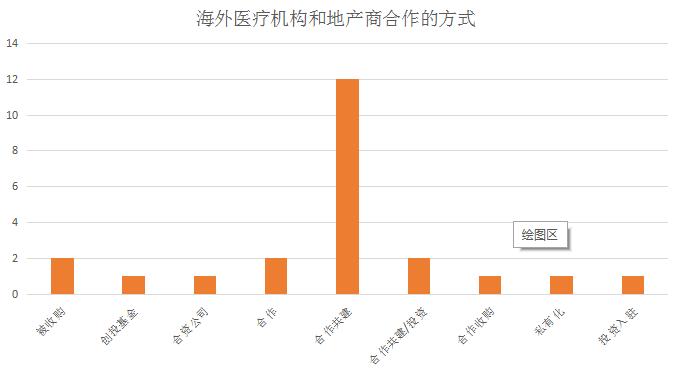 从双方合作的方式看,一共有9种,包括被收购、创投基金、合资公司、合作、合作共建、投资、合作收购、私有化、投资入驻。在众多方式中,地产商与海外医疗机构以合作共建的最多,数量高达12家。