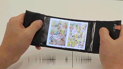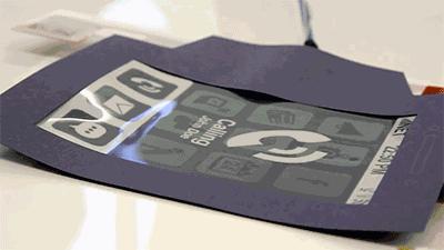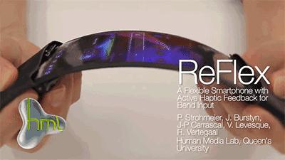 图中这款来自加拿大皇后大学的原型机,名为Reflex,当你用它来看书时,只需弯曲手机屏幕就可以进行翻页,加大弯曲的力度,翻页速度也会加快。