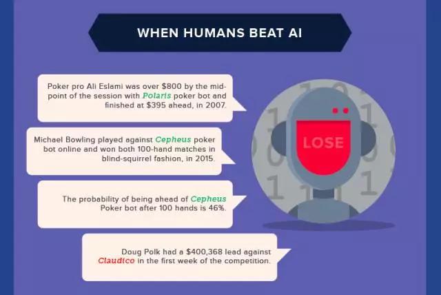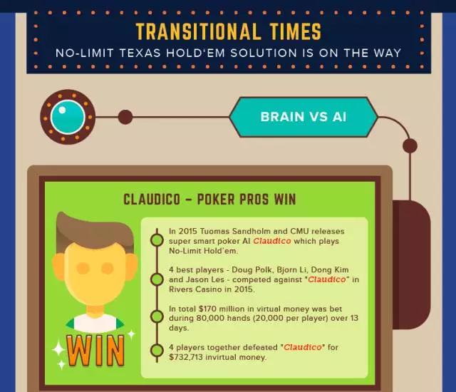 9.2015年,有限下注的比赛以及被阿尔伯塔大学的扑克机器人Cepheus攻克。