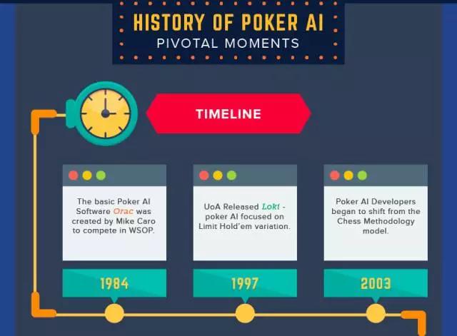 扑克网站pokersites.me.uk近日发布了一篇文章,以信息图的方式,完整地介绍了人类开发AI程序以对抗扑克玩家的里程,从1984年开始,我们已经在这一方向上探索了30多年,在2017年获得最值得骄傲的成功。冷扑大师“ Libratus” 和DeepStack 不仅仅意味着在扑克上的突破,更多的是深度学习和人工智能综合性的成就和技术高度。