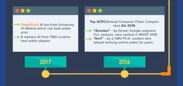 10. 2016年,在ACPC上出现了两个顶级的AI:1)前谷歌工程师Eric Jackson 开发的Slumbot,在WSOP上大赚一笔;2)CMU 博士生开发的“Act1”数年来在线上扑克对战中保持常胜。