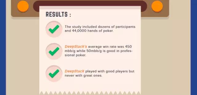 结果:整个研究涉及了几十名参与者,包含了44万手扑克。DeepStack的平均获胜率是450 mbb/g,在专业扑克玩家中,50 mbb/g的赢率就可以称得上是优秀了。与DeepStack对战的都是优秀的玩家,但是,它还没有与顶级玩家过招。