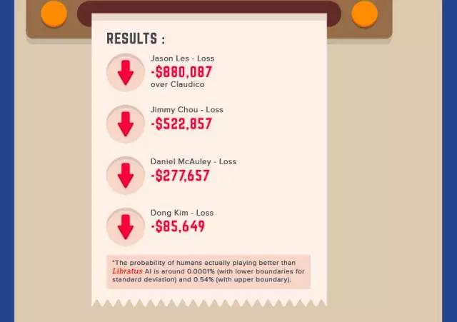 所有的四名人类玩家都输掉了自己的3万手对抗,等于输掉了176万6250美元。