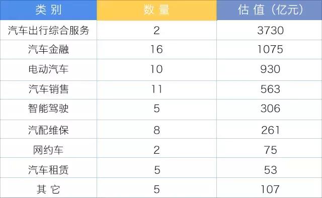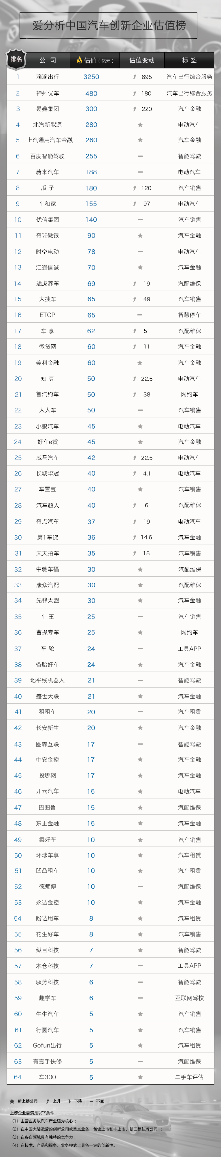 本榜单共包含汽车行业12个细分领域,包括汽车出行综合服务、汽车金融、电动汽车、汽车销售、智能驾驶、汽配维保、网约车、汽车租赁、工具APP、二手车评估、智慧停车和互联网驾校等。榜单总估值7100亿元,中位数为30亿,入围门槛为5亿估值。