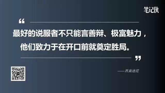 而《先发影响力》一书,则以此为基础并进一步提出新的观点,即最好的说服者不只能言善辩、极富魅力;而且,他们也是富有创造力的铺路人,他们致力于在开口前就奠定胜局。