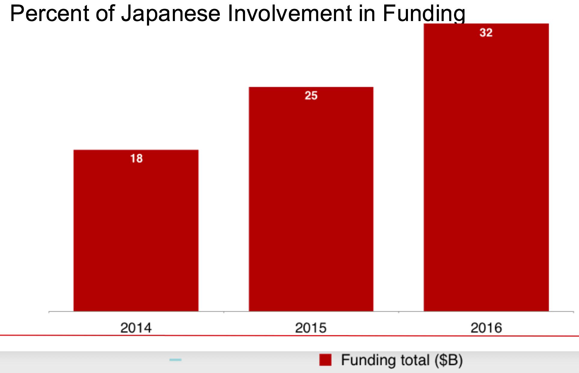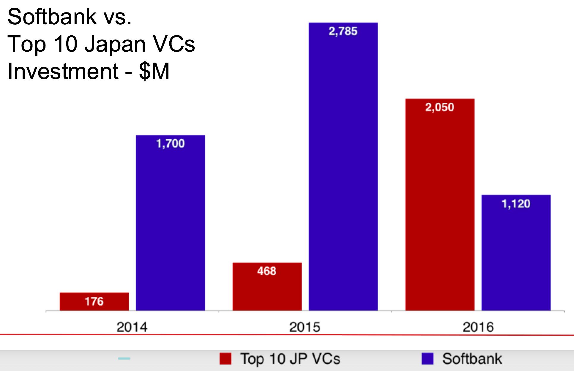 2014 年至 2015年,软银集团投资额超过日本十大 VC 公司投资总额,但是到了 2016 年就被它们反超了。尽管那一年软银集团发起了 高达 1000亿美元的科技基金。