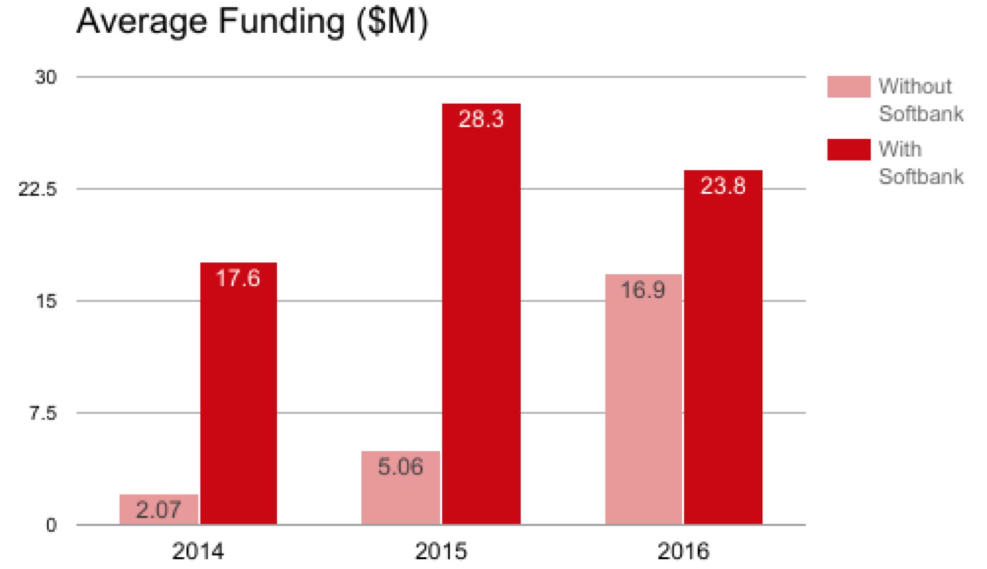 此外,值得注意的是:日本软银集团仍是一支重要力量,有它参与的投资轮通常都高于行业平均水平(下图)。深红色为有日本软银参与的投资轮,单位为百万美元。
