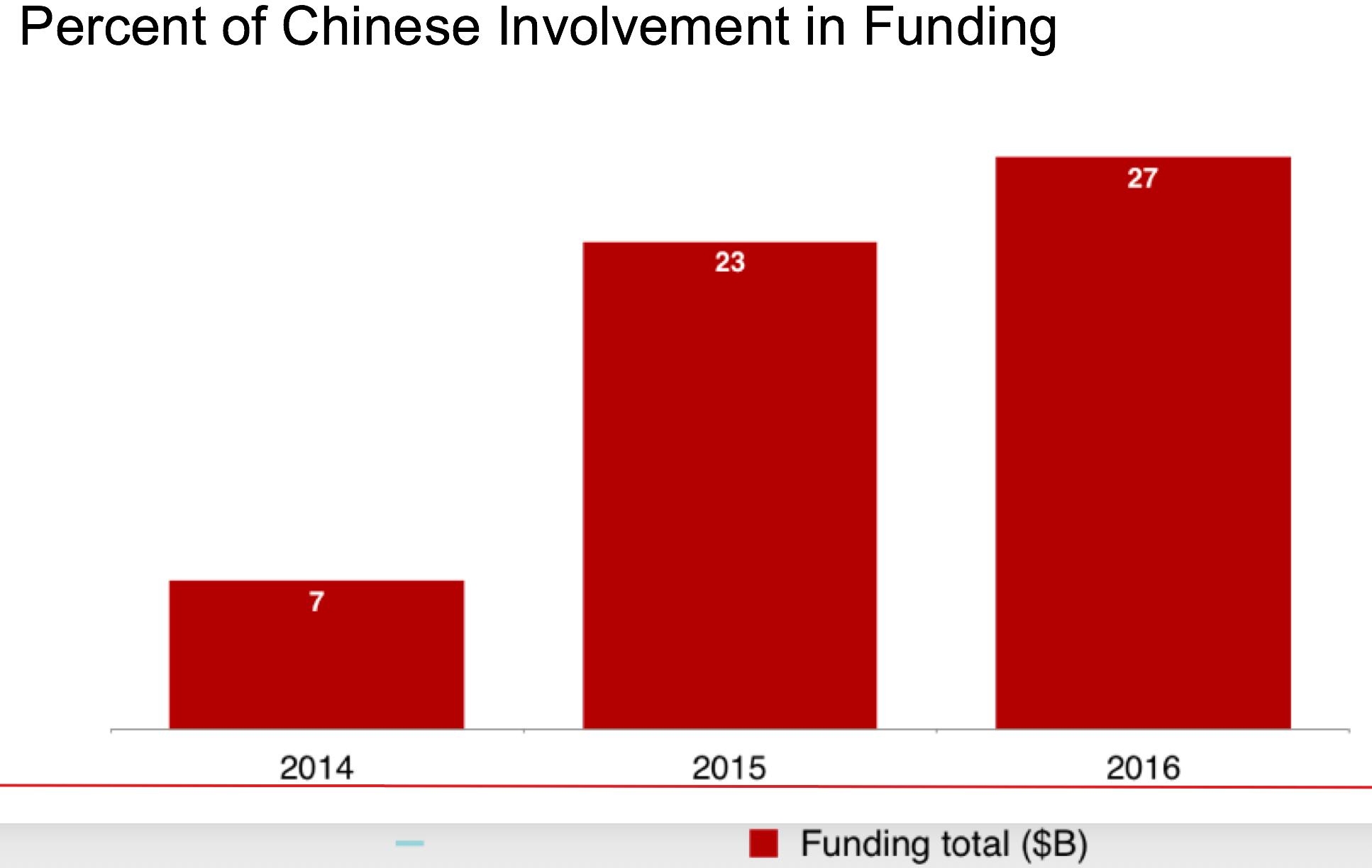 在亚洲科技行业,中国资本力量有重要影响(下图),2016 年占投融资总额的 26%。然而,中国资本并不是第一推动力。