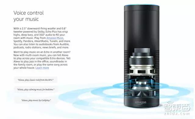 3)同样采用杜比音效,加入专用的0.8”高音单元,和2.5”低音单元,支持360度音频,支持亚马逊音乐,潘多拉,Spotify,iHeartRadio,TuneIn等音乐。而且当你使用亚马逊音乐时,你可以通过歌词/时间段来搜索音乐,还可以让Alexa根据你的喜好为你挑歌。