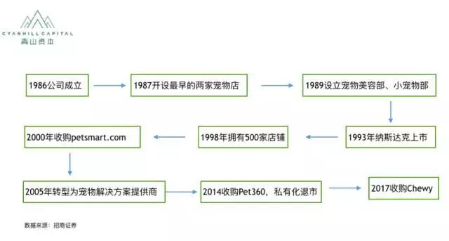 PetSmart以宠物食品起家,后续顺应宠物的消费升级,转型为宠物服务上,提高盈利能力,增强用户粘性,之后又收购Pet360和Chewy,布局线上渠道。