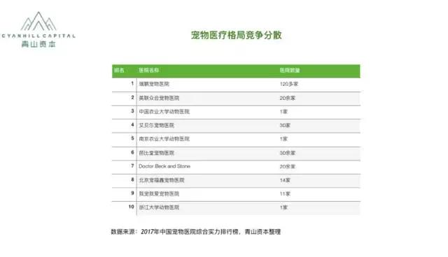 目前宠物医疗行业的竞争格局分散,行业龙头企业瑞鹏门店数量占比仅为1.2%,收入占比不足1%;行业客户满意度排名前10的医院规模总和占总市场规模比例不足3%。在宠物医疗领域存在着比较大的后期资本整合机会,早期进入门槛相对比较高。