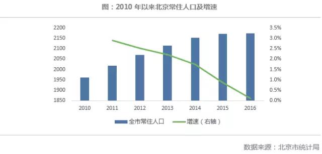 人口持续流入是房价上涨的长期动力,持续不断的人口流入产生未来供不应求的预期,同时只有需求的不断涌入才能使改善性换房成为可能。近年来北京改善性需求达到70%左右。人口疏解和总量控制意味着需求的约束,首次置业需求的增速将会减缓,对应换房需求的规模也会下降。北京人口增速在近几年已经出现了明显的下滑,北京市2016年常住人口为2172.9万人,因此到2020年仅有127.1万人的缺口,人口增速的放缓和总量约束有利于抑制房价上涨的动力。