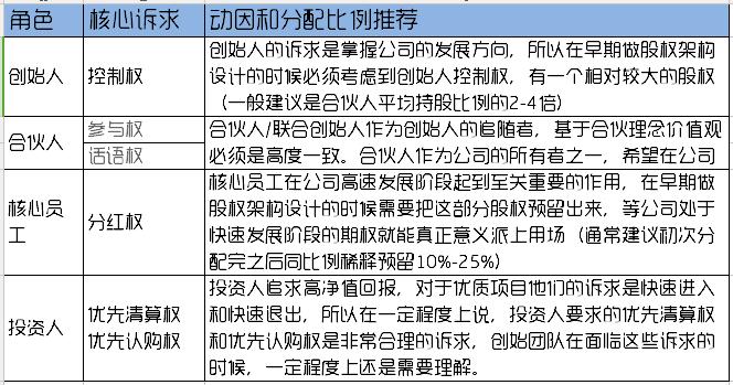创业公司早期最为核心的四类人:创始人、合伙人、核心员工、投资人。他们都是属于公司也是早期风险的承担者和价值贡献输出者,但是每种角色的人核心诉求却不同。为了让大家齐心协力干事情,一开始要根据初始状态量化好每个人的初始股权,同时由于未来合伙人对公司贡献值的不确定性,所以又会加入动态股权这个工具来进行管理,一方面是持续激励,二方面是保持团队和谐(很多时候就是因为出力多少,对公司后期贡献的不同,导致团队散伙)