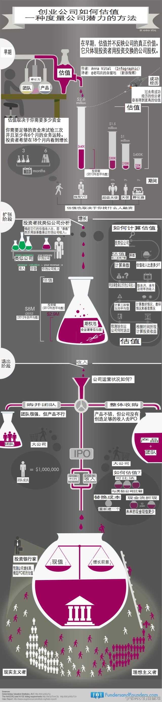 公司估值在风险投资中是个非常重要的问题,它决定了投资人的投资可获得的股权比例。公司估值可分为投资前估值和投资后估值,二者的关系为:投资后估值=投资前估值+投资额,而投资人获得的公司股权比例=投资额÷投资后估值。