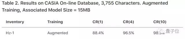 下图展示了使用CNN的运行结果,其中“Hz-1”指的是一级字符库(3755个字符),“CR(n)”表示输入法界面排序为n的可能字符的准确度。除了常见的“最可能字”(top-1)和top-10的准确性外,我们也特意提到了top-4的准确性,因为输入法界面一开始会显示4个可能汉字,而top-4的准确性是用户体验提升的重要指标。