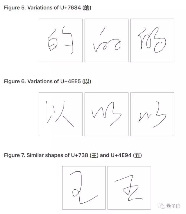 事实上,在日常生活中,用户输入经常是“随便画几笔”,出现一种非常不相似的曲线变化。有时也会让系统混淆成其他字符。下图展示了我们在数据中观察到的一些具体例子。需要注意的是,有足够的训练数据能区分像Figure 7这样的草书变化很重要。