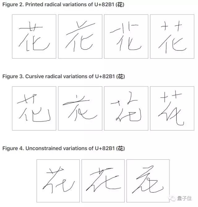 因此,我们又收集了不同年龄段、性别和不同教育背景的用户数据,发现了各种各样的书写风格。下图显示了样例中“花”字在楷书、草书和“随便画几笔”风格下的样本。