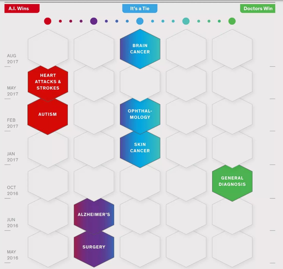 IEEE Spectrum 日前公布了一个“记分牌”,显示了在医疗领域的各个子类中,AI 和人类医生谁更占优势。用 IEEE Spectrum 的话说,“AI 正在医疗领域对医生发起挑战,我们一直在记分”。