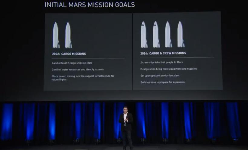 马斯克公布火星计划的最初目标:2022年至少两艘货运飞船着陆火星;2024年实现两艘货运飞船及两艘载人飞船着陆。
