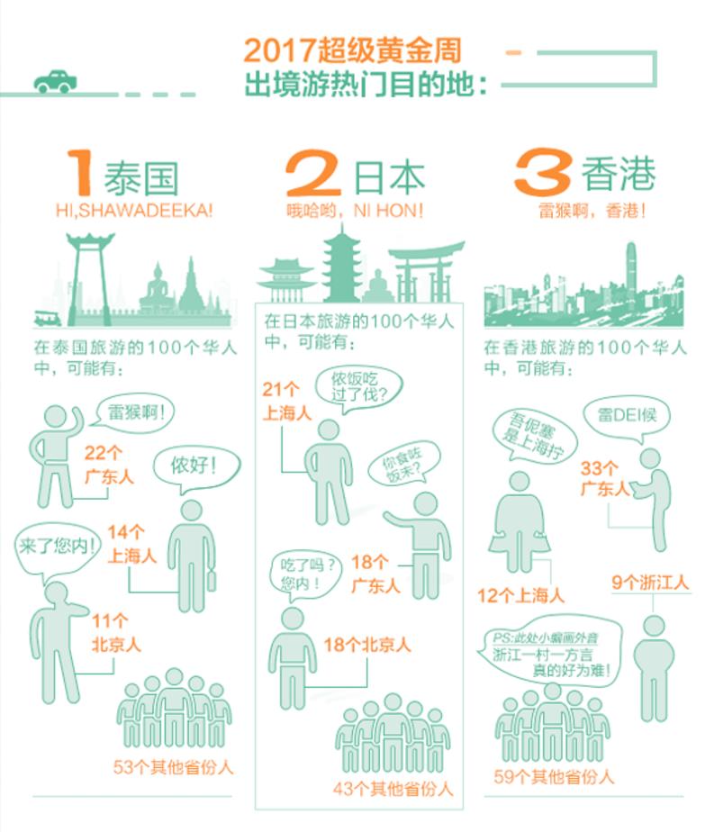 最后关于行中的一个问题,他们去哪儿呢?大概你也能猜到,热门目的地都是离我们不远的亚洲国家和地区。前三名分别是泰国、日本和香港,去这些地方,你最有可能见到的华人,当然是离他们最近的发达省份的宝宝了。按这个逻辑,北京人是占领俄罗斯了吗?