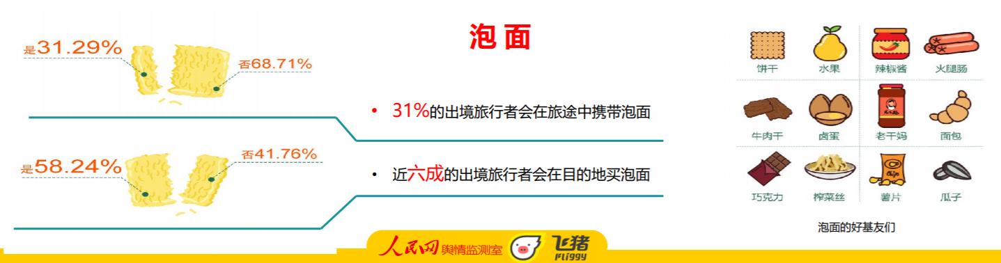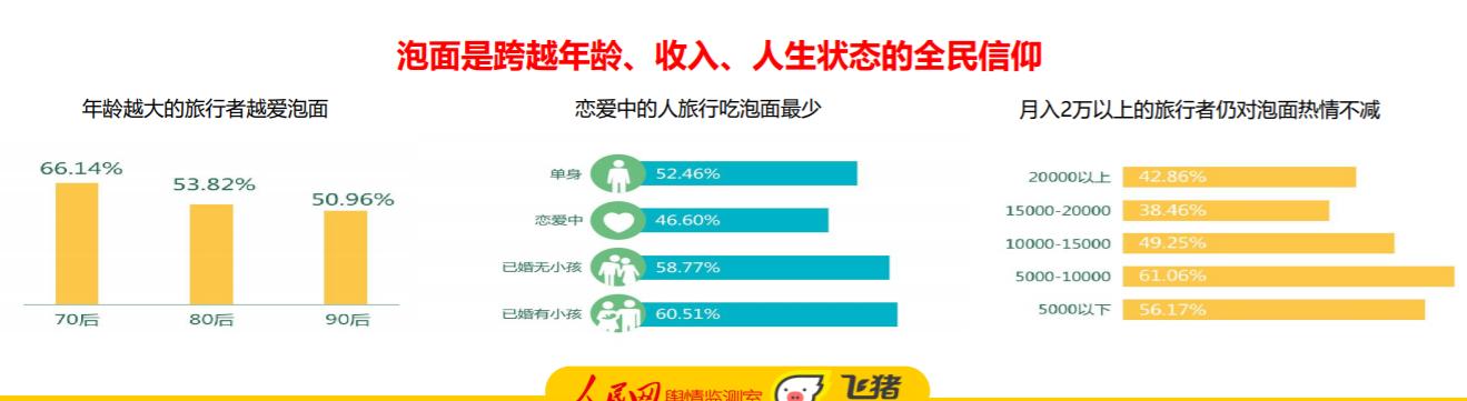 话说,这个特征,跟我前几天看到的,有点不一样啊。前几天飞猪跟人民网的合作,说出境游人群喜欢带泡面和在目的地买泡面,而且无论什么年龄和收入,都有一半左右的人旅行中离不开泡面的陪伴。
