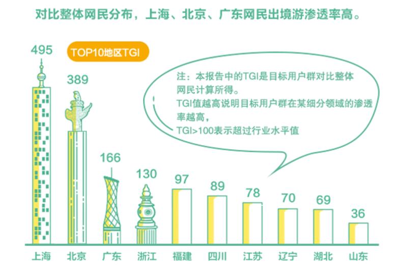 出境游在哪些地区比较流行?大概你也猜到了是北上广,对比整体网民分布,上海、北京、广东网民出境游渗透率高。但是这三家哪家渗透率最高你可能就不一定猜对了,答案是非常洋气的大上海。