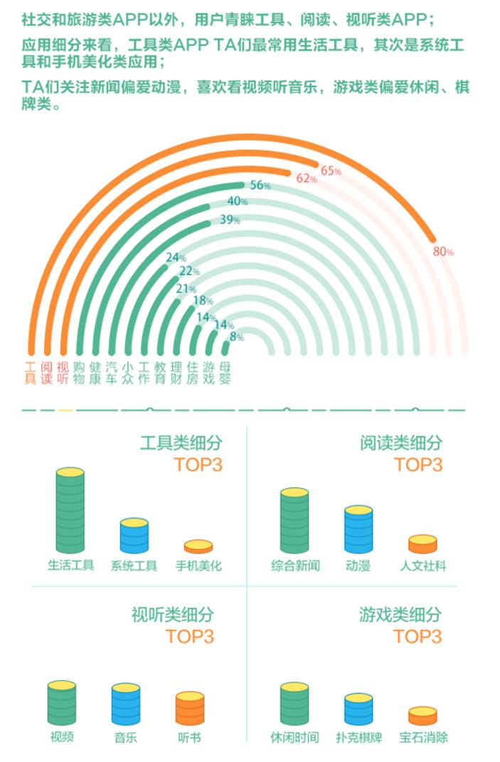 根据报告,这些人喜欢用工具、阅读APP,同时,对视听和购物APP感兴趣。应用细分来看,他们最常用的工具类APP是生活工具,其次是系统工具和手机美化类应用;他们关注新闻偏爱动漫,喜欢看视频听音乐,游戏类偏爱休闲、棋牌类。