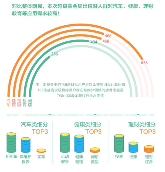 对比整体网民,本次超级黄金周出境游人群对汽车、健康、理财、教育等应用需求较高。看到这里,不禁觉得最重要的还是消费力,毕竟买得起车、有财可理的人,有更多闲余资金用于出境游。