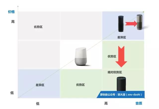我们之前在文章Alexa的全场景较量中,系统提出了智能音箱竞争的分析框架。以价格和音质两大关键要素,把主要竞争产品平摊在矩阵图中做博弈分析。