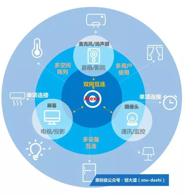 在设备的最里层,是以Echo show 为典型代表的新型设备。同时具备了扬声器、屏幕和摄像头,它能充当中间层设备的连接者,把家庭的摄像头、电视和音箱做一个最终的整合。