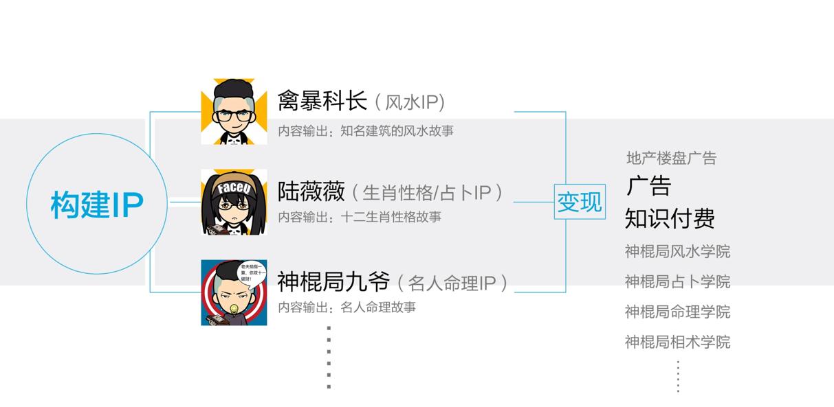 内容方面,神棍局的整个策略主要还是以构建虚拟化IP为主,禽暴科长长于风水、陆薇薇擅长生肖性格和占卜,神棍局九爷主打个人命理。杨苗波表示,目前已经有地产楼盘找来希望投放广告,但是现阶段还没打算走广告的盈利模式,而是先尝试做家居风水方面的知识付费。内容团队的视频制作人员将重点负责该部分业务,未来课程完成之后会打包出去售卖。