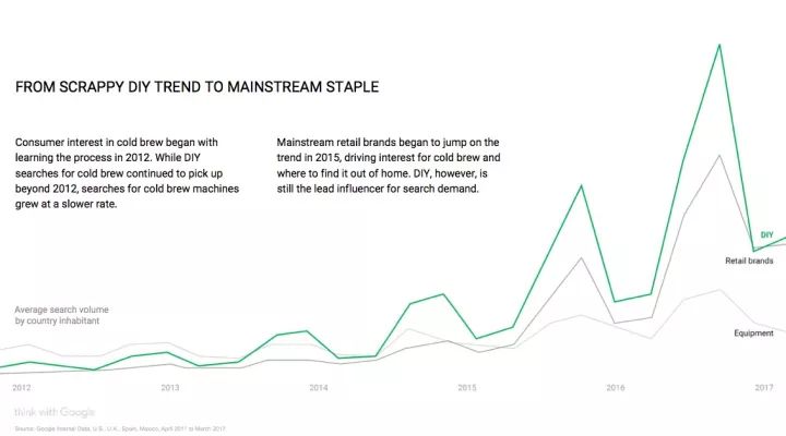 报告显示,Youtube 上 DIY 冷萃咖啡的教程非常多,而用户对 DIY 内容的需求一直都远高于零售品牌对冷萃产品给予的关注。