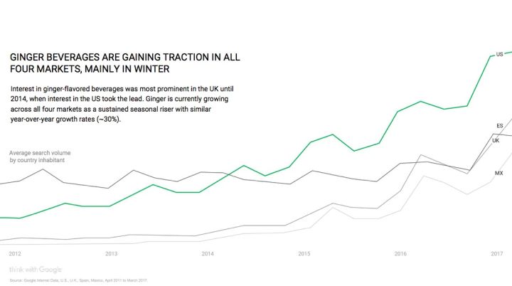 至于生姜口味,美国人在 2014 年正式超过英国,成为 4 个市场中最热衷寻找关于生姜口味饮料信息的国家。