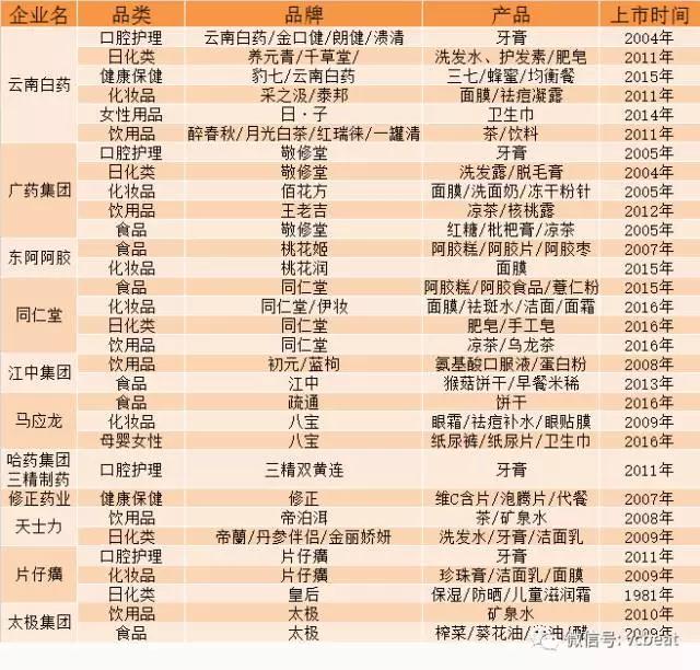 当然,近两年药企跨界最爱涉足的领域当属日化、化妆品类,云南白药、东阿阿胶、广药集团、同仁堂、片仔癀等企业均开发了个人洗护、祛痘、面膜等产品。