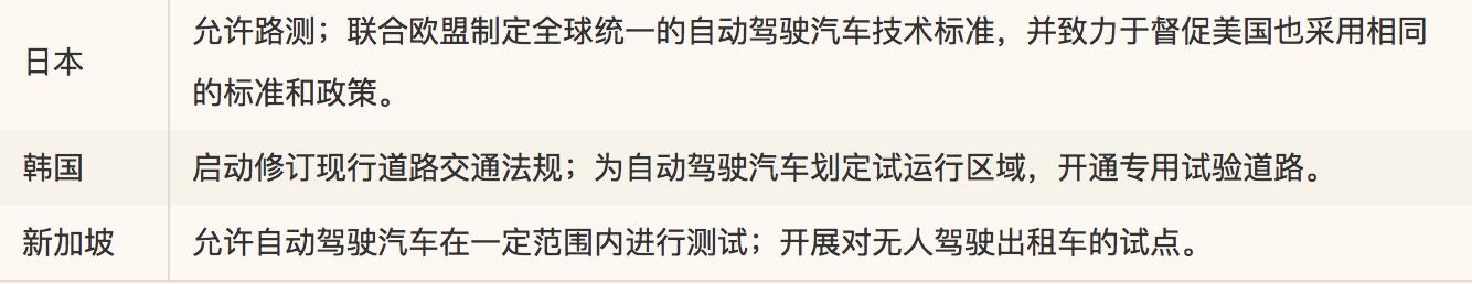 除了美国和德国以外,下文表格中所列其他国家也都大力支持自动驾驶的发展,并开启了在测试、标准和立法层面的探索。