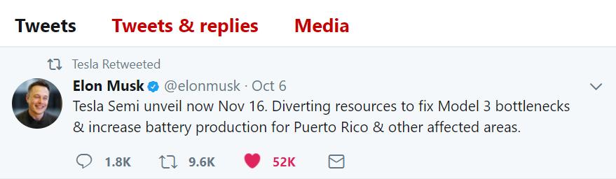 10月7日早上,Musk发了一条Twitter,宣布将特斯拉重型卡车Tesla Semi发布会从10月26日推迟至11月16日,在这期间特斯拉将集中精力解决Model 3生产线上的小问题以及提高电池产能以解决波多黎各州及其他受灾地区的电网受损问题。