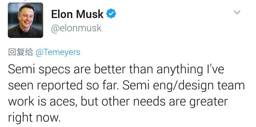 谈到特斯拉重型卡车的时候,Musk再次兴奋起来:“(特斯拉)重卡原型车的规格比目前媒体曝光的所有谍照都要好,重卡工程/设计团队做的相当出色,但现在一些其他问题(比重卡发布会)排在了更高的优先级。”