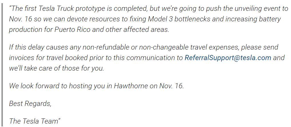 按照惯例,特斯拉官方Twitter转发了老板的消息,随后特斯拉向受邀的媒体和车主发送邮件,表示“第一辆特斯拉重卡原型车已经完成,但由于Balabala……我们决定将发布会推迟至11月16日。如果有发布会延迟导致的任何不可退或更改的差旅费用,可以将发票寄至ReferralSupport@tesla.com,我们将为你处理。”
