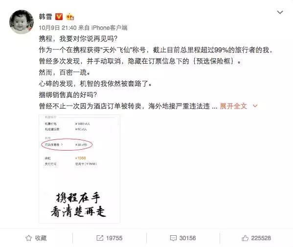 尽管携程为用户提供了取消购买打包产品的选择,但由于取消选择的入口颇深,多数用户在购买过程中很难察觉,因此很多用户便在不知情的情况下购买了携程默认绑定的其他产品。10月9日,艺人韩雪发表微博,加入声讨携程的行列,将舆论声讨推向新的台阶。