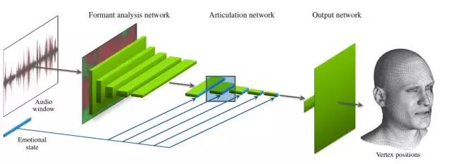 当网络的输入为时长大约半秒的音频时,输出是与音频窗口的中心相对应的固定拓扑网格的3D顶点位置。该网络还有一个用于描述情绪状态的二次输入。其神经网络直接从训练数据中学习情绪状态,不进行任何形式的预标记(pre-labeling)。