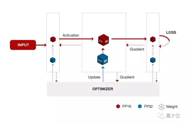 通过在训练中使用FP16的权重,可以使用适用于半精度的、更快的硬件。下图显示了混合精度训练中的一次迭代: